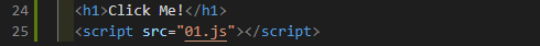h1태그 내용을 작성한 후, 이벤트는 01.js 파일에 적고 로드하는 HTML 코드이다. 동일하게 <script> 태그를 사용하지만, 태그 안에 src="<Javascript 파일 상대 경로> 를 적어주면서 load하는 방법이다. 현재 01.js 파일이 같은 디렉토리에 있기 때문에, 상대경로로는 파일 이름만 적어줘도 된다.