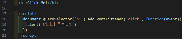 body 안에 h1태그를 생성 한 후, script안에서 해당 h1태그를 선택한 후 click 함수를 추가하는 코드이다. 18번째 줄에서 document(문서 전체)에서 h1태그를 선택한 후, addEventListener를 통해서 click event를 달아주는 모습을 볼 수 있다.