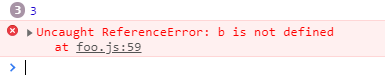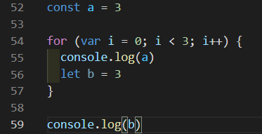 a는 중괄호 밖에서 선언되었으니 global scope이고, for문 안에서 접근이 가능하다. 따라서 콘솔에 a값인 3이 3번 찍혔다. 하지만 for문 안에서 선언된 b는 block scope이기 때문에 for문 밖에서 접근이 불가능하다. 따라서 b is not defined라고 뜨는 것이다.