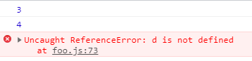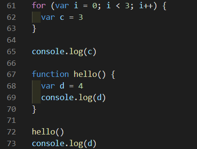 단순 block인 for문 내부에서 선언된 var c는 밖에서 접근이 가능하다. let으로 선언했던 아까의 사진의 b는 block scope라 접근이 불가능했던 점과 차이가 있다. 한편 function hello()에서 선언된 d는 function 내부에서는 4로 console에 출력되었지만, hello가 실행되고 난 이후 밖에서는 접근할 수가 없다. 이것은 var이 function-level scope이기 때문에 function 밖에서는 접근할 수 없고, 단순 block 밖에서는 접근할 수 있기 때문이다.