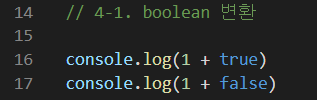 Javascript에는 암묵적 타입 변환이 있다. 이 것은 보통은 불가능한 연산이지만 강제적으로 타입을 변화시켜서 연산을 해버리는 것을 말한다.