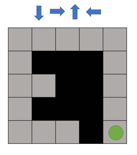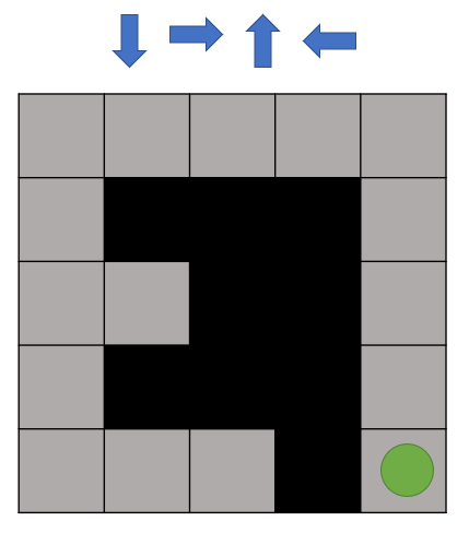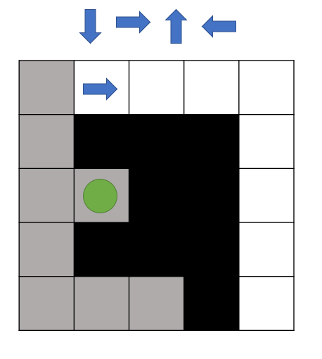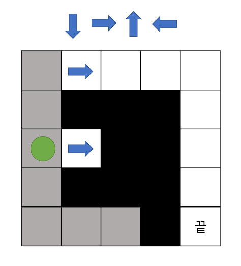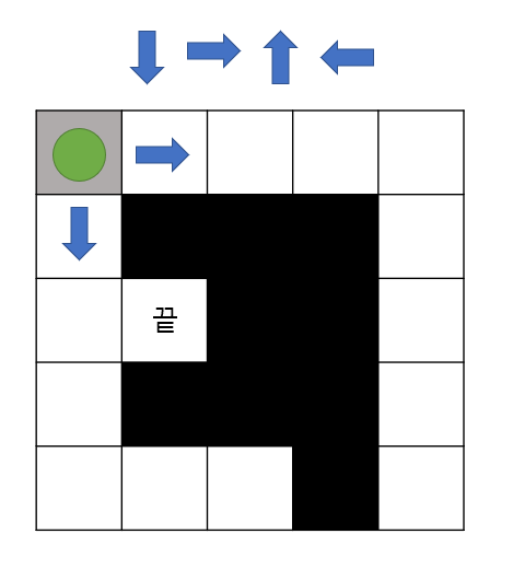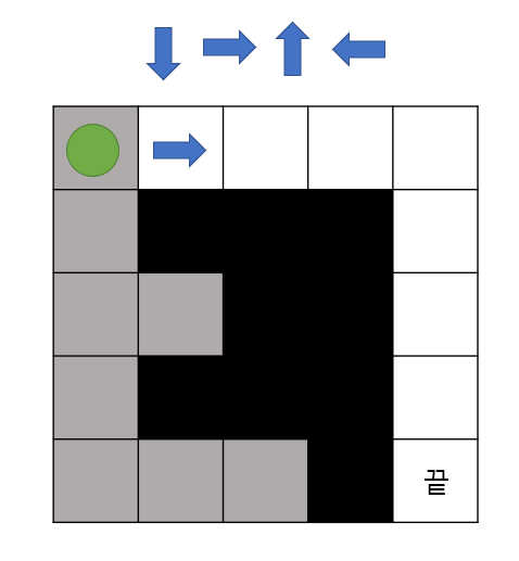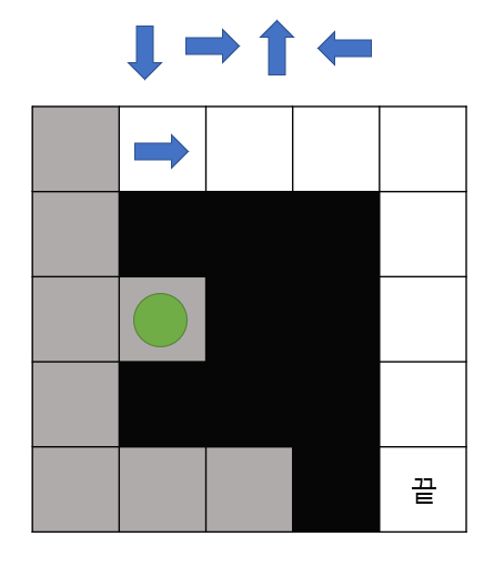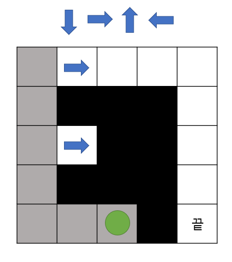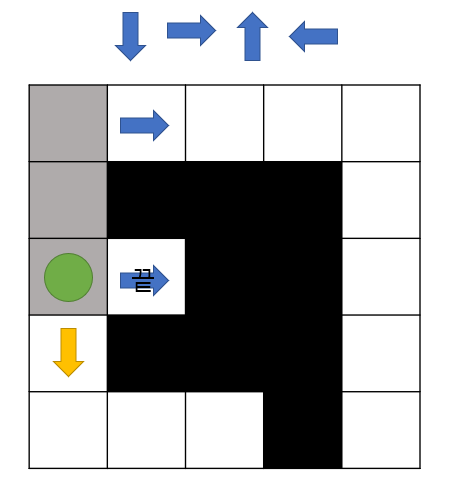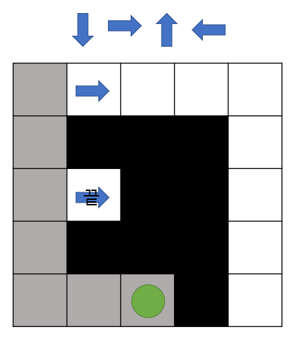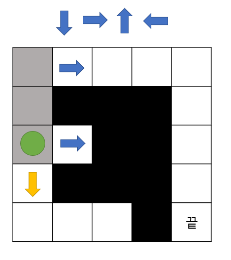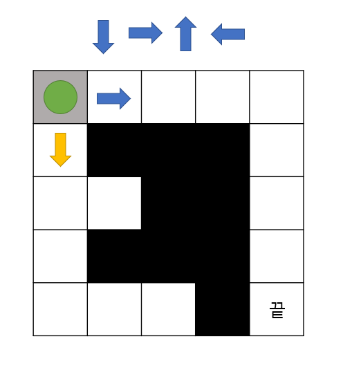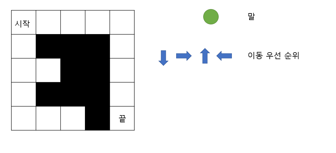 - 말이 시작점에서 끝점을 찾아가야하며 아래, 오른쪽 위, 왼쪽의 우선순위를 가지고 탐색을 합니다.