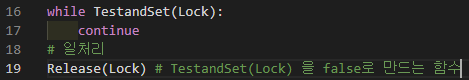 정확한 코드는 아니며 이해를 돕기위해 작성한 코드입니다. Test and Set의 Test는 사용가능한지 확인 하는 것을 말하며, Set은 내가 사용하고 있음을 알리는 것을 말합니다.