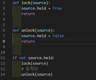 Lock은 자원이 사용중인지를 나타내는 어떠한 변수를 True로 바꾸면서 걸 수 있습니다.